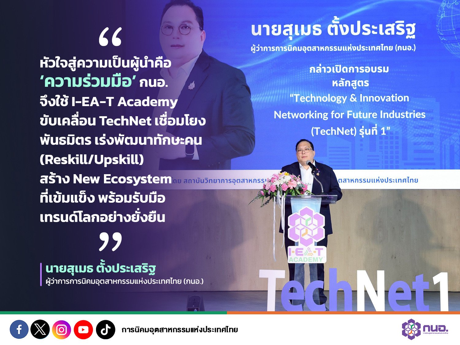 “หัวใจสำคัญของการขับเคลื่อนอุตสาหกรรมไทยให้ก้าวจากการเป็นผู้ตาม ขึ้นมาเป็นผู้นำในระดับภูมิภาคได้นั้น คือ ‘ความร่วมมือ’ ระหว่างภาครัฐ ภาคเอกชน และสถาบันการศึกษา กนอ. จึงมุ่งมั่นให้ TechNet เป็นต้นแบบแห่งการพัฒนาที่ยั่งยืน โดย I-EA-T Academy จะทำหน้าที่เป็นศูนย์กลางในการถักทอเครือข่ายพันธมิตร (Partnership) เชื่อมโยงตั้งแต่นักพัฒนานวัตกรรมไปจนถึงผู้ปฏิบัติงานจริง พร้อมยกระดับทักษะทั้ง การสร้างทักษะใหม่(Reskill), การยกระดับทักษะเดิม (Upskill) และ การพัฒนาทักษะเชิงลึก (Deep skill) เพื่อสร้างระบบนิเวศอุตสาหกรรมใหม่ (New Ecosystem) ที่เข้มแข็ง และเปลี่ยนผ่านบุคลากรให้เป็นบุคลากรคุณภาพ (Talent) ที่มีศักยภาพ พร้อมรับมือกับกติกาการค้าโลกและเทรนด์ความยั่งยืนในอนาคต”ผู้ว่าการ กนอ.กล่าวทิ้งท้าย