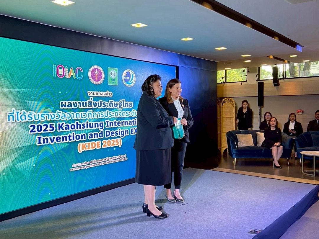 งานแถลงข่าวผลงานสิ่งประดิษฐ์ดังกล่าวจัดขึ้นโดยสำนักงานการวิจัยแห่งชาติ (วช.) โดยได้รับเกียรติจาก ดร.วิภารัตน์ ดีอ่อง ผู้อำนวยการสำนักงานการวิจัยแห่งชาติ เป็นประธานในพิธีเปิดงาน ทั้งนี้ ผวก. ได้มอบหมาย นางสาวนลินี กาญจนามัย รผก.บร., นางสาวปฐมา ฤกษเสน ผอ.ฝพอ., นางสาวสุภัทรา แย้มสรวล ผอ.กจต. เป็นผู้แทน กนอ. พร้อมด้วย รองศาสตราจารย์ ดร.ชนะศึก นิชานนท์ รองอธิการบดีมหาวิทยาลัยสวนดุสิต (มสด.) และทีมอาจารย์ นักวิจัย จาก มสด. เข้าร่วมงานแถลงข่าวผลงานสิ่งประดิษฐ์ไทยที่ได้รับรางวัลจากเวทีการประกวดระดับนานาชาติ “2025 Kaohsiung International Invention and Design EXPO (KIDE 2025)” พร้อมทั้งร่วมเสวนาแลกเปลี่ยนประสบการณ์ “Innovation Excellence to Industry : ความสำเร็จที่ต่อยอดได้จริง” จากผลงานนวัตกรรม ดังนี้