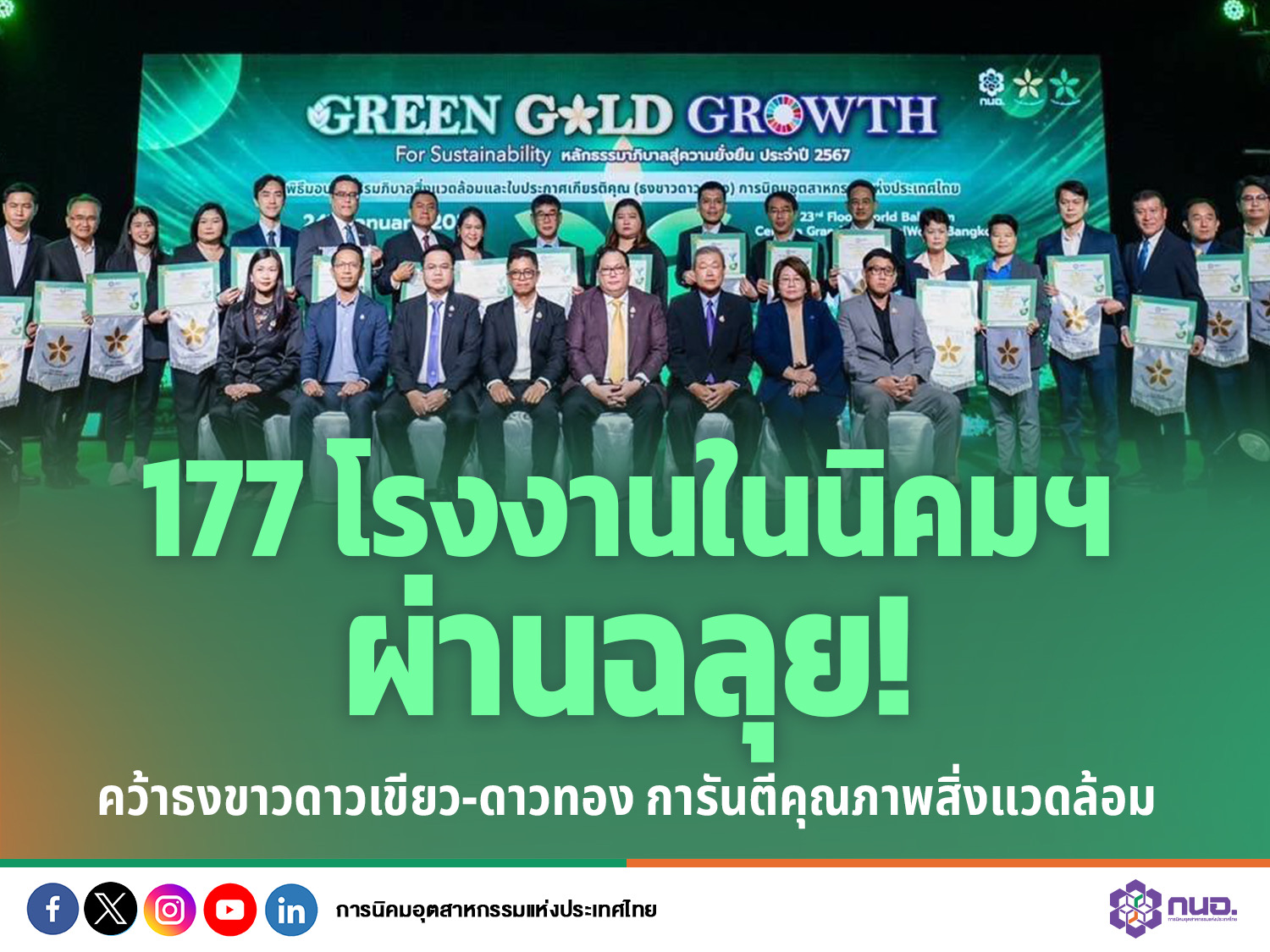นายสุเมธ ตั้งประเสริฐ กรรมการ การนิคมอุตสาหกรรมแห่งประเทศไทย (กนอ.) ในฐานะรักษาการผู้ว่าการ กนอ. เปิดเผยว่า กนอ.ได้เริ่มดำเนินโครงการธรรมาภิบาลสิ่งแวดล้อม หรือธงขาวดาวเขียว (Green Star Award) มาตั้งแต่ปี 2550 โดยจะมอบธงสัญลักษณ์ดาวสีเขียว เพื่อยกย่องให้เป็นโรงงานต้นแบบด้านสิ่งแวดล้อมและความปลอดภัย ให้แก่โรงงานที่มีผลการประเมินการดำเนินงานใน 5 มิติ 13 หัวข้อ ประกอบด้วย มิติกายภาพ, มิติเศรษฐกิจ, มิติสิ่งแวดล้อม, มิติด้านสังคม และมิติการบริหารจัดการได้ตามมาตรฐาน ซึ่งต้องอยู่ในเกณฑ์ดี-ดีเยี่ยม รวมทั้งมีในส่วนของธงสัญลักษณ์ดาวสีทองให้แก่โรงงานที่มีผลการประเมินได้ตามมาตรฐานอยู่ในเกณฑ์ดี-ดีเยี่ยมต่อเนื่องเป็นเวลา 6 ปี เพื่อเชิดชูเกียรติให้กับโรงงานที่รักษาระดับการบริหารจัดการที่ดีได้อย่างต่อเนื่อง โดยโรงงานที่ได้รับรางวัลนอกจากผ่านเกณฑ์การตรวจประเมินโครงการแล้ว ยังจะต้องไม่มีข้อร้องเรียน หรือคำสั่งให้ปรับปรุงแก้ไข รวมถึงไม่มีอุบัติเหตุร้ายแรง ตั้งแต่วันที่รับการประเมินโครงการฯ ปี 2567 จนถึงปัจจุบัน