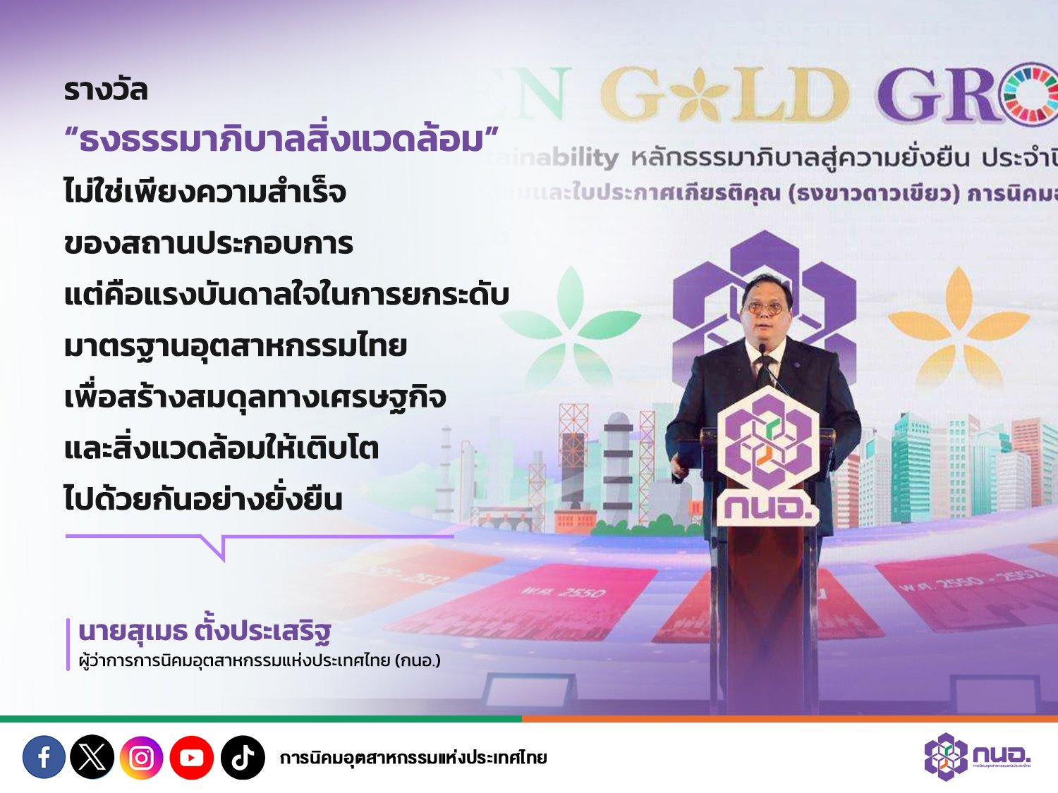 นายสุเมธ ตั้งประเสริฐ ผู้ว่าการการนิคมอุตสาหกรรมแห่งประเทศไทย (กนอ.) เป็นประธานในพิธีมอบธงธรรมาภิบาลสิ่งแวดล้อมและใบประกาศเกียรติคุณ ประจำปี 2568 เพื่อยกย่องโรงงานที่มีมาตรฐานการจัดการสิ่งแวดล้อมและมีความรับผิดชอบต่อสังคมในระดับดีเยี่ยม โดยระบุว่า กนอ. มุ่งมั่นนำนิคมอุตสาหกรรมสู่มาตรฐานสากลด้วยนวัตกรรมอย่างยั่งยืน มุ่งเน้นการบรรลุเป้าหมายก๊าซเรือนกระจกสุทธิเป็นศูนย์ (Net Zero) ภายในปี 2050 ผ่านการส่งเสริมเศรษฐกิจหมุนเวียน (Circular Economy) เพื่อลดของเสียให้เหลือน้อยที่สุด และยกระดับโรงงานสู่มาตรฐานอุตสาหกรรมสีเขียว (Green Industries) โดยโครงการธรรมาภิบาลสิ่งแวดล้อมเป็นกลไกสำคัญในการสร้างความโปร่งใส ตรวจสอบได้ และส่งเสริมการมีส่วนร่วมของภาคประชาชนในการกำกับดูแลโรงงาน เพื่อให้ภาคอุตสาหกรรมและชุมชนอยู่ร่วมกันได้อย่างมีความสุข