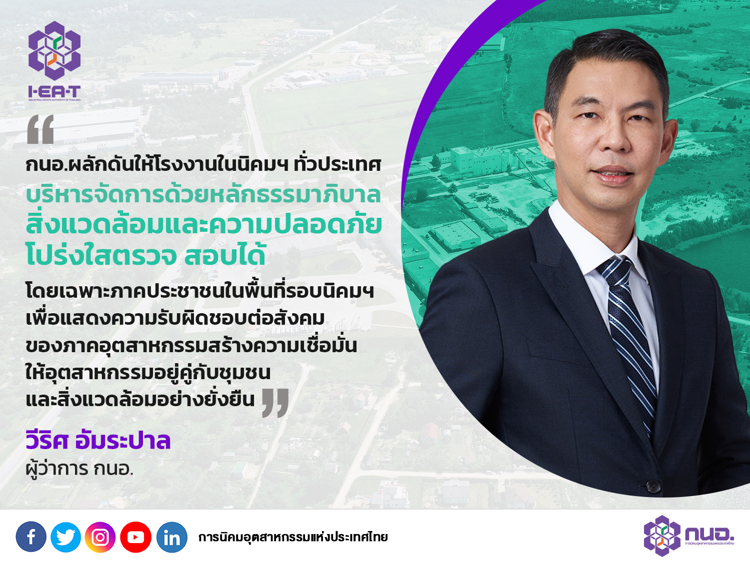 “กนอ. จะผลักดันให้โรงงานที่อยู่ในนิคมอุตสาหกรรมทั่วประเทศ บริหารจัดการด้วยหลักธรรมาภิบาลสิ่งแวดล้อมและความปลอดภัยในด้านต่างๆ ที่ได้มาตรฐาน มีความโปร่งใส ตรวจสอบได้ โดยเฉพาะประชาชนในพื้นที่รอบนิคมอุตสาหกรรมและใกล้เคียง ซึ่งแสดงให้เห็นถึงความรับผิดชอบต่อสังคมของภาคอุตสาหกรรม สร้างความเชื่อมั่นให้กับชุมชนโดยรอบ เพื่อพัฒนาอุตสาหกรรม ให้อยู่คู่กับชุมชนและสิ่งแวดล้อมอย่างยั่งยืนต่อไป” ผู้ว่าการ กนอ. กล่าวปิดท้าย