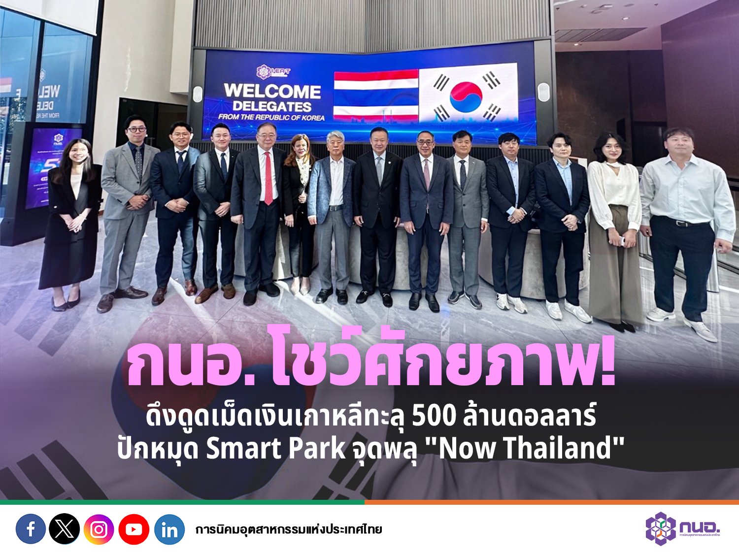 นายยุทธศักดิ์ สุภสร ประธานกรรมการ กนอ. เปิดเผยว่า กนอ.ได้ให้การต้อนรับนายธานี แสงรัตน์ เอกอัครราชทูต สถานเอกอัครราชทูต ณ กรุงโซล พร้อมด้วยคณะนักลงทุนเกาหลีใต้กว่า 20 ราย ในการเข้าร่วมประชุมหารือและรับฟังข้อมูลภาพรวมการลงทุนในประเทศไทย สิทธิประโยชน์ และการให้บริการของ กนอ. โดยได้เน้นย้ำถึงแคมเปญ “Now Thailand - The Golden Era”เพื่อสื่อสารให้นักลงทุนเกาหลีใต้รับรู้ว่า “นี่คือยุคทอง โอกาสทองของการลงทุนในประเทศไทย ไม่มีเวลาใดที่ดีไปกว่านี้แล้ว” สร้างความเชื่อมั่นและพร้อมให้การสนับสนุนนักลงทุนเกาหลีใต้ในการประกอบกิจการในนิคมอุตสาหกรรมของไทย