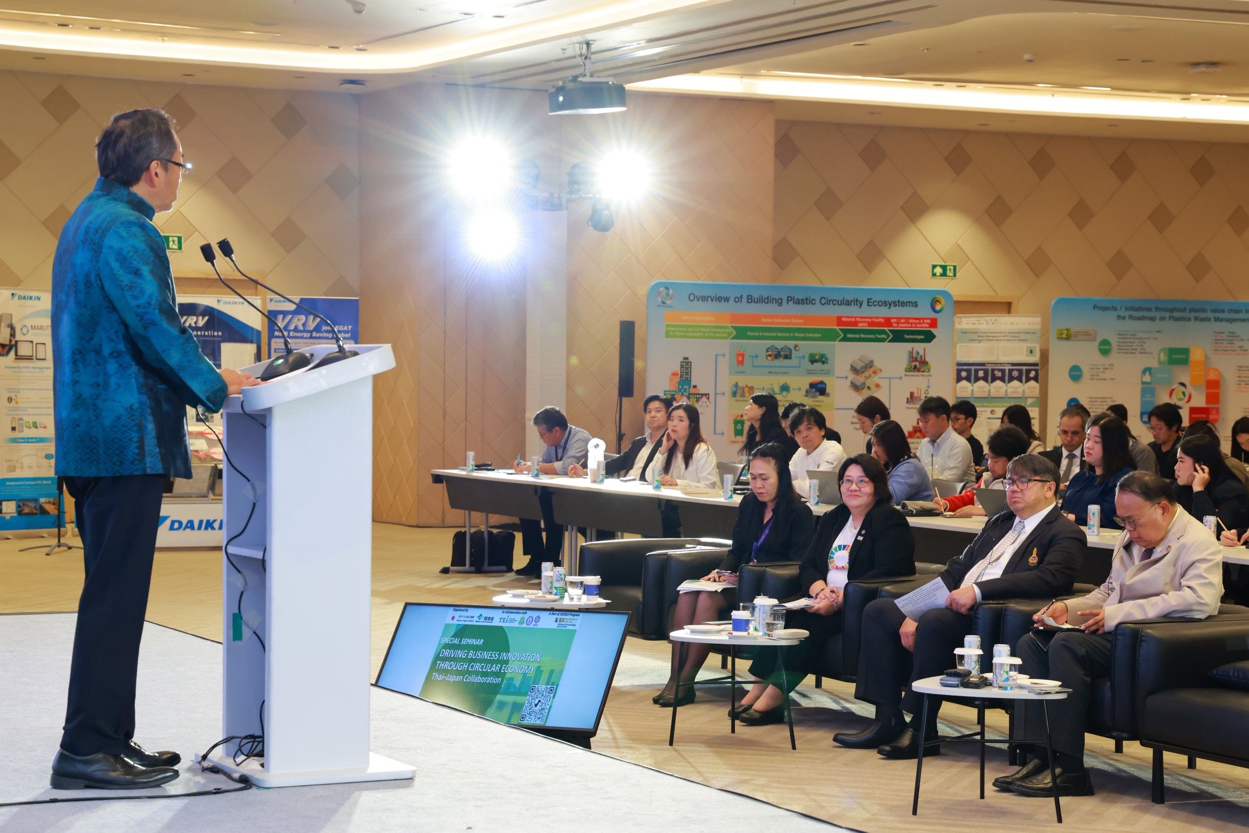 วันที่ 2 ตุลาคม 2568 ณ งานมหกรรมด้านความยั่งยืน 2025 (Sustainability Expo 2025) นางบุปผา กวินวศิน รผก.พย. เป็นผู้แทน กนอ. เข้าร่วมการกล่าวปาฐกถาพิเศษในงาน ความร่วมมือไทย – ญี่ปุ่น: ขับเคลื่อนนวัตกรรมธุรกิจผ่านเศรษฐกิจหมุนเวียน โดยได้รับเกียรติจาก นายโอตากะ มาซาโตะ เอกอัครราชทูตญี่ปุ่นประจำประเทศไทย เป็นประธานในพิธี โดยมีผู้เข้าร่วมการกล่าวปาฐกถาพิเศษ หัวข้อ “จากนโยบายสู่การปฏิบัติ: เศรษฐกจิหมุนเวียนเ เส้นทางสู่ Net Zero และความยั่งยืนระดับโลก” ประกอบด้วย 1) นายโดอิ เคนทาโร Vice-Minister for Global Environment Affairs กระทรวงสิ่งแวดล้อมแห่งประเทศญี่ปุ่น 2) ดร.วิจารย์ สิมาฉายา ผู้อำนวยการสถาบันสิ่งแวดล้อมไทย 3) นายสุนทร แก้วสว่าง รองปลัดกระทรวงอุตสาหกรรม 4) นางบุปผา กวินวศิน รองผู้ว่า (พัฒนาที่ยั่งยืน) การนิคมอุตสาหกรรมแห่งประเทศไทย 5) นางสาววานิช สาวาโย ผู้เชี่ยวชาญเฉพาะด้านการจัดการกากของเสียและสารอันตราย กรมควบคุมมลพิษ กระทรวงทรัพยากรธรรมชาติและสิ่งแวดล้อม ณ ห้อง 208-209 ชั้น 2 ศูนย์การประชุมแห่งชาติสิริกิติ์ งานมหกรรมด้านความยั่งยืน 2025 (Sustainability Expo 2025) โดยมีวัตถุประสงค์เพื่อนำเสนอ นโยบาย มาตรการ รวมถึงสถานการณ์ความร่วมมือระหว่างประเทศด้านเศรษฐกิจหมุนเวียน ตลอดจนทิศทางการพัฒนาในอนาคต