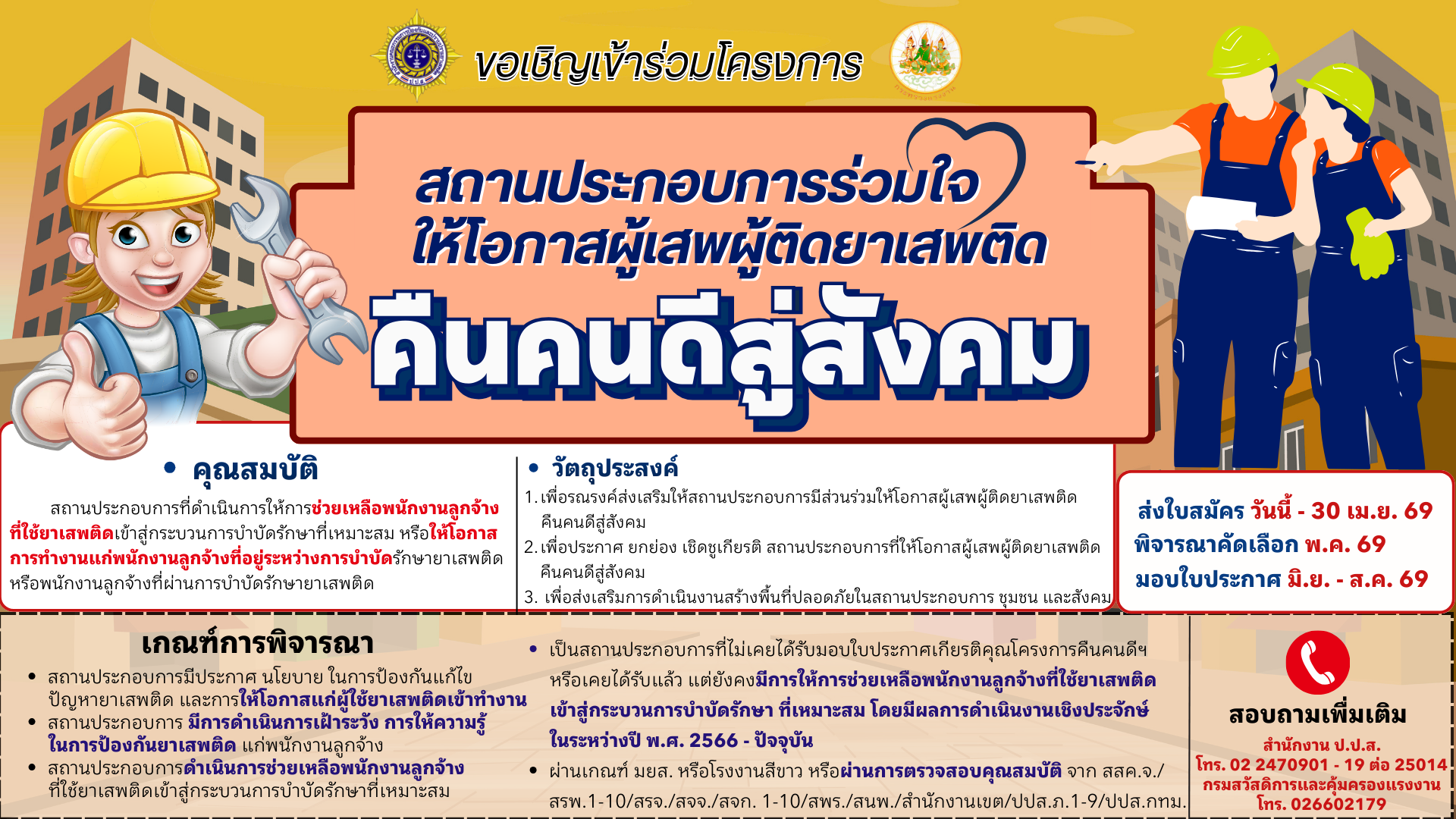 สำนักงานคณะกรรมการป้องกันและปราบปรามยาเสพติด (สำนักงาน ป.ป.ส.) จัดโครงการสถานประกอบการร่วมใจให้โอกาสผู้เสพผู้ติดยาเสพติดคืนคนดีสู่สังคม ปีงบประมาณ พ.ศ. 2569 โดยมีวัตถุประสงค์เพื่อยกย่องเชิดชูเกียรติ เสริมแรงจูงใจ ให้สถานประกอบการดำเนินการให้โอกาสผู้เสพผู้ติดยาเสพติดได้มีงานทำ มุ่งหวังให้แรงงานมีคุณภาพชีวิตที่ดี พัฒนาเศรษฐกิจ สังคมมั่นคง มั่งคั่ง ยั่งยืน ซึ่งได้ดำเนินการอย่างต่อเนื่องตั้งแต่ปีงบประมาณ พ.ศ. 2562 ซึ่งสอดคล้องกับประมวลกฎหมายยาเสพติด มาตรา 3 ที่กำหนดมาตรการในการป้องกันปราบปราม และแก้ไขปัญหายาเสพติด ตลอดจนการบำบัดรักษาและฟื้นฟูผู้ติดยาเสพติด โดยการส่งเสริมและสนับสนุนการประกอบอาชีพ การจัดหางาน และการพัฒนาคุณภาพชีวิต รวมถึงการส่งเสริมและสนับสนุนให้ทุกภาคส่วนและผู้ประกอบธุรกิจเข้ามามีส่วนร่วมในการดำเนินการ และการกำหนดมาตรการส่งเสริมแก่ผู้ประกอบธุรกิจในการรับผู้ผ่านการบำบัดรักษาเข้าทำงาน