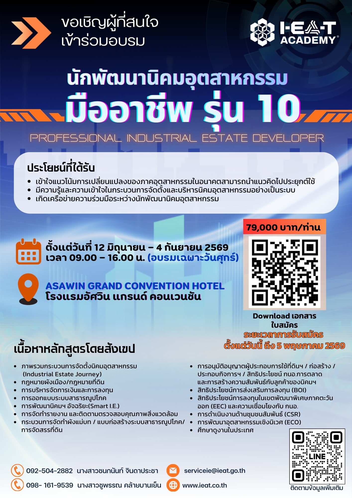 การนิคมอุตสาหกรรมแห่งประเทศไทย (กนอ.) จัดอบรมหลักสูตร "นักพัฒนานิคมอุตสาหกรรมมืออาชีพ รุ่นที่ 10" ภายใต้สถาบันวิทยาการอุตสาหกรรม กนอ. เพื่อเป็นการส่งเสริมให้ภาคเอกชนและผู้ที่สนใจดำเนินธุรกิจการจัดตั้งนิคมอุตสาหกรรมร่วมดำเนินงานกับ กนอ. มีความรู้ ความเข้าใจในกระบวนการขั้นตอนการจัดตั้ง พัฒนา และบริหารจัดการนิคมอุตสาหกรรม โดยเริ่มตั้งแต่แนวคิดการพัฒนานิคมอุตสาหกรรมการวิเคราะห์ และประเมินโครงการ รวมทั้งการสร้างเครือข่ายการมีส่วนร่วมของชุมชน เพื่อนำไปสู่การปฏิบัติจริง ระหว่างวันที่ 12 มิถุนายน - 4 กันยายน 2569 ณ โรงแรมอัศวิน แกรนด์ คอนเวนชัน สามารถกรอกใบสมัครเข้าร่วมหลักสูตรฯ โดยดาวน์โหลดใบสมัครผ่าน QR Code และส่งมาทาง email: [email protected] ภายในวันที่ 5 พฤษภาคม 2569 หรือติดต่อได้ที่ คุณชนกนันท์ จินดาประชา โทรศัพท์ 09-2504-2882 และนางสาวชูพรรณ คล้ายบานเย็น โทรศัพท์ 09-8161-9539 เป็นผู้ประสานงานให้ข้อมูลรายละเอียดหลักสูตรฯ